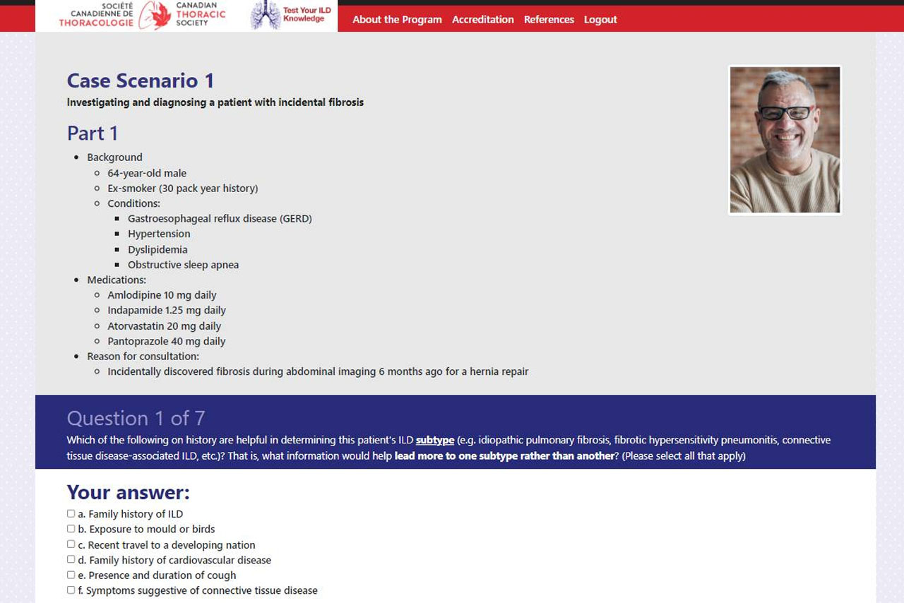 Developed by Drs. Margaret Kelly, Deborah Assayag, Daniel Marinescu, Giang Nguyen, and Alyson Wong, the program is directed to respirologists, medical trainees (residents, fellows, etc.), and other healthcare professionals who diagnose, treat, and manage ILD patients.